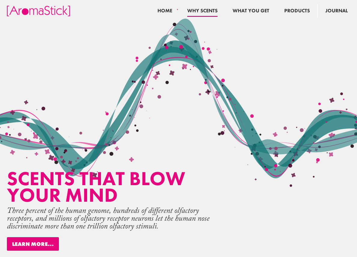 Gerüche optisch ansprechend darzustellen war eine Herausforderung, jedenfalls wenn diese im Mittelpunkt stehen. Durch die Zusammenarbeit eines kreativen Entwicklers aus unserem Netzwerk, werden die Animationen durch Zufall generiert und animiert. Die Geruchswellen werden von der Interaktion mit der Maus beeinflusst, ähnlich wie es etwa Rauchschwaden tun würden, wenn man mit der Hand dadurch wischt.