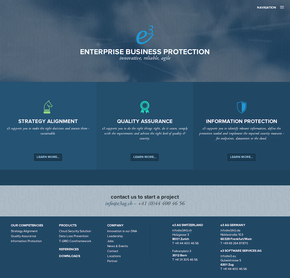 Vor kurzem wurde unser neustes Web-Projekt veröffentlicht. Wir haben die e3 Website neu gestaltet und mit Wordpress umgesetzt. Der neue, moderne und solide Look repräsentiert die Zukunftspläne der Firma und vermittelt die Professionalität, mit welcher die e3 ihre Projekte angeht.